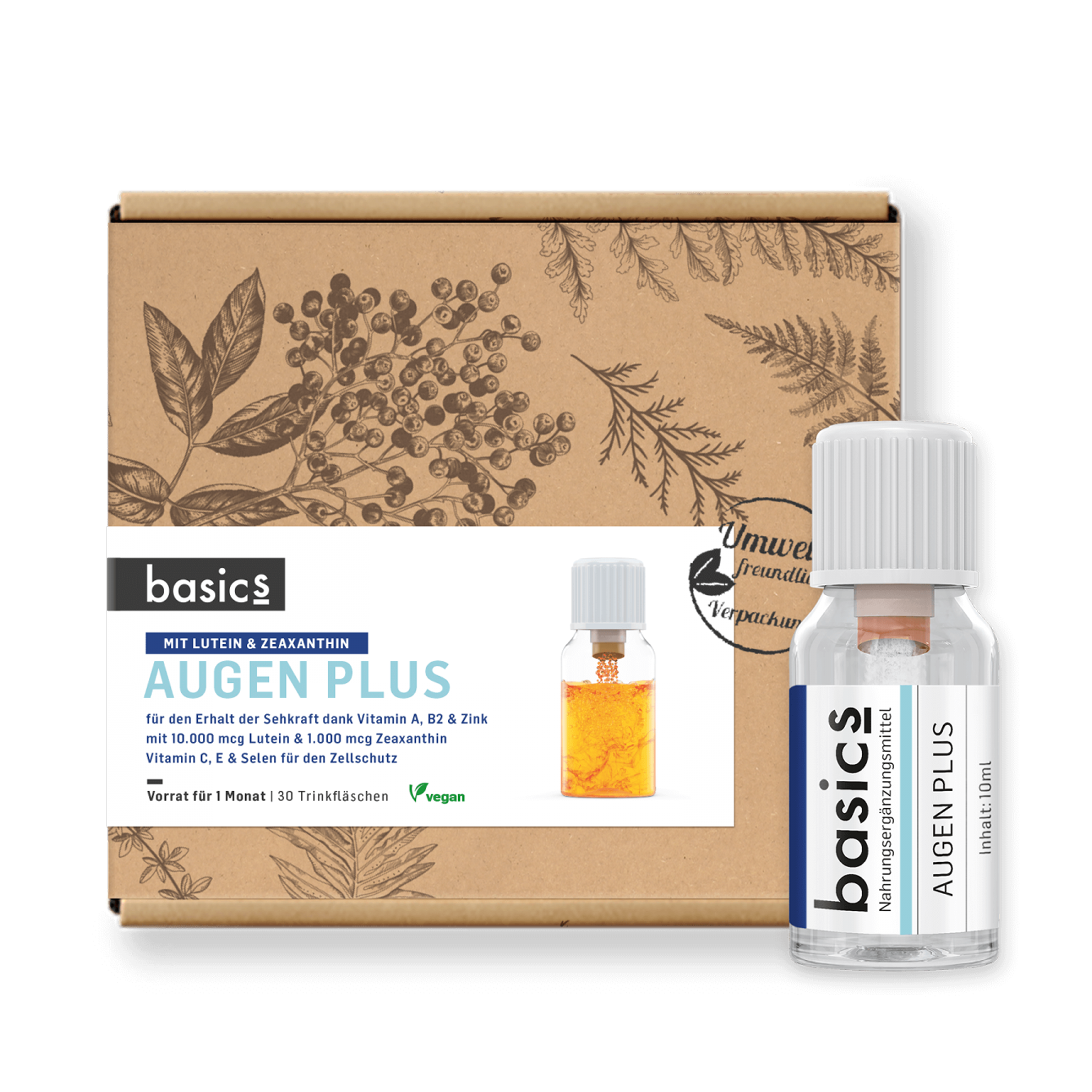 Ob Bildschirmarbeit, Autofahren oder Sonnenlicht: Unsere Augen leisten Tag für Tag erstaunliches und sind dabei vielen Einflüssen ausgesetzt. basics Augen Plus versorgt dich gezielt mit wichtigen Vitaminen, Mineralstoffen und Pflanzenstoffen – für deine tägliche Unterstützung von innen.
