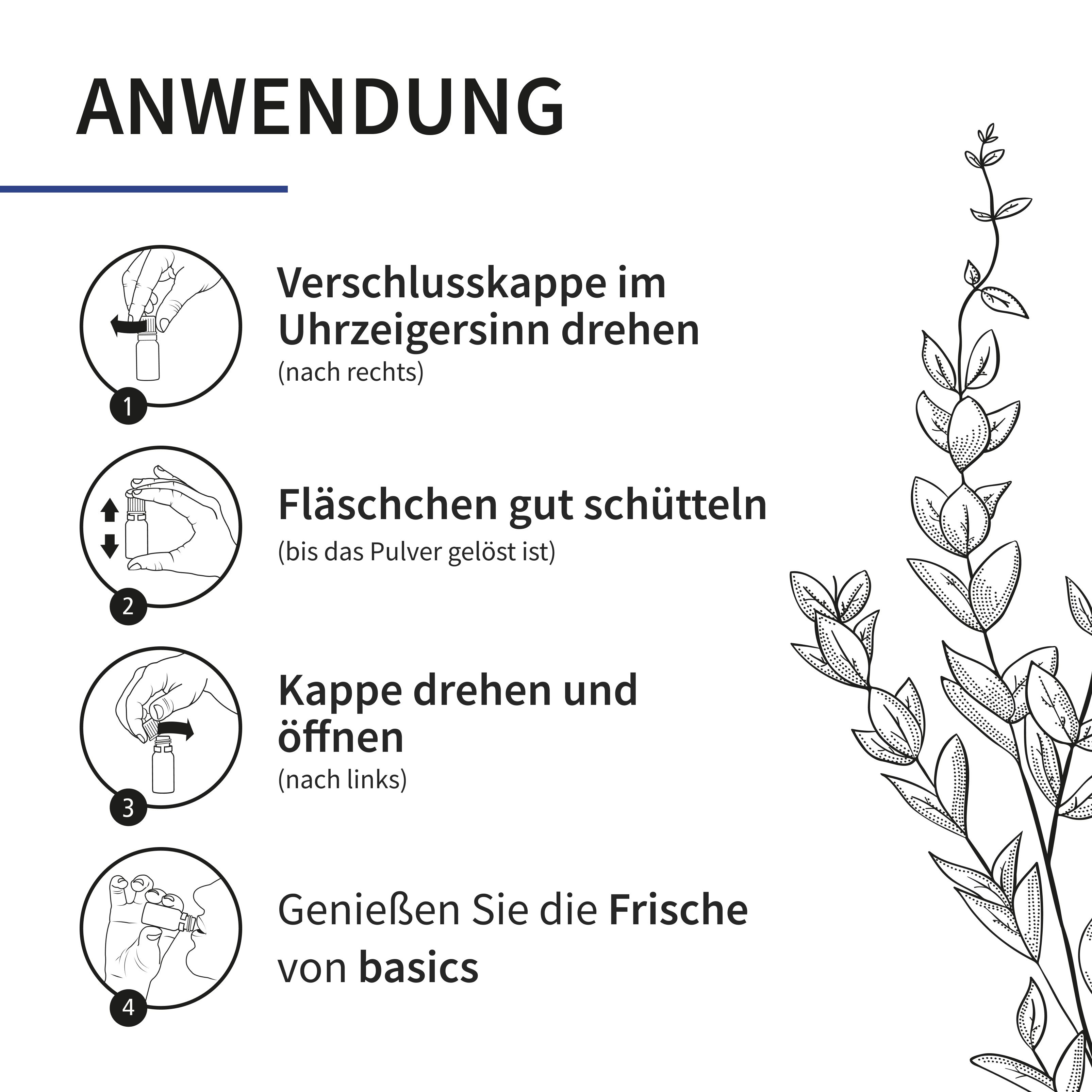 Dank unseres innovativen 2-Kammer-Systems genießt du immer frisch gemischte Inhaltsstoffe – einfach, wann und wo du möchtest. basics Augen Plus ist 100% vegan sowie laktose-, gluten- und fruktosefrei. Künstliche Farb- und Aromastoffe kommen bei uns nicht ins Fläschchen.