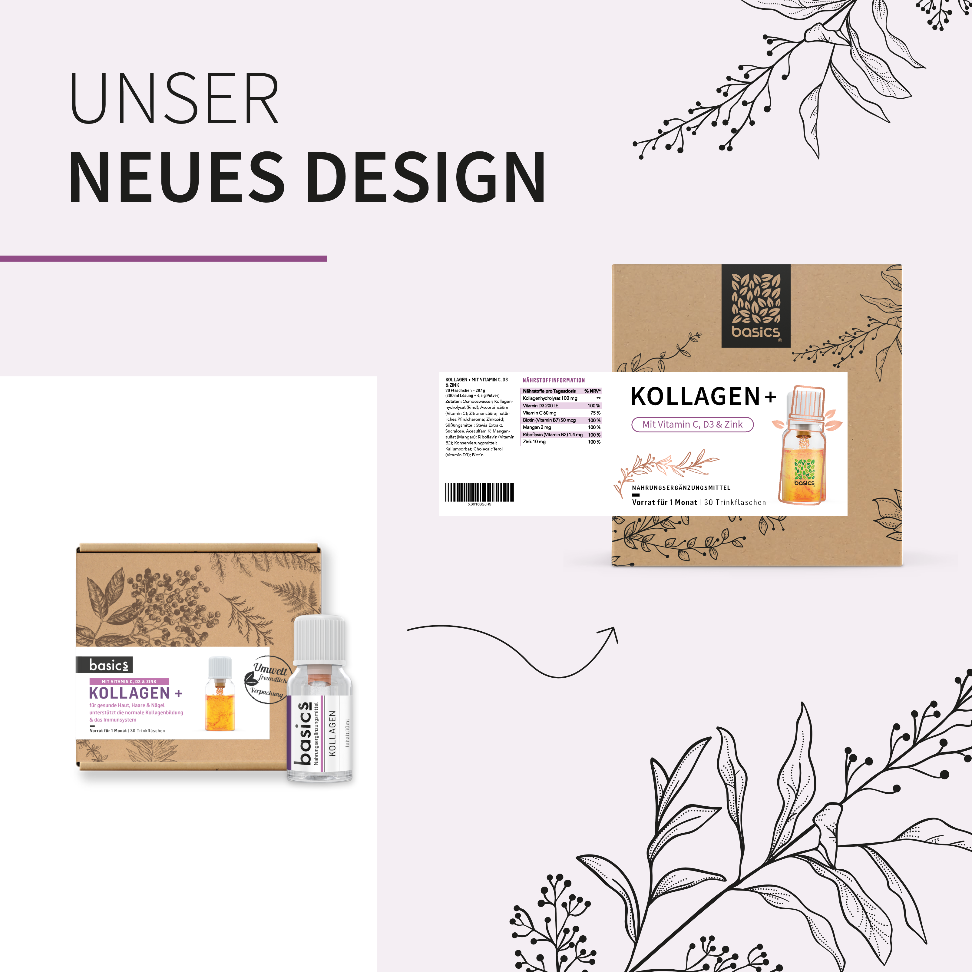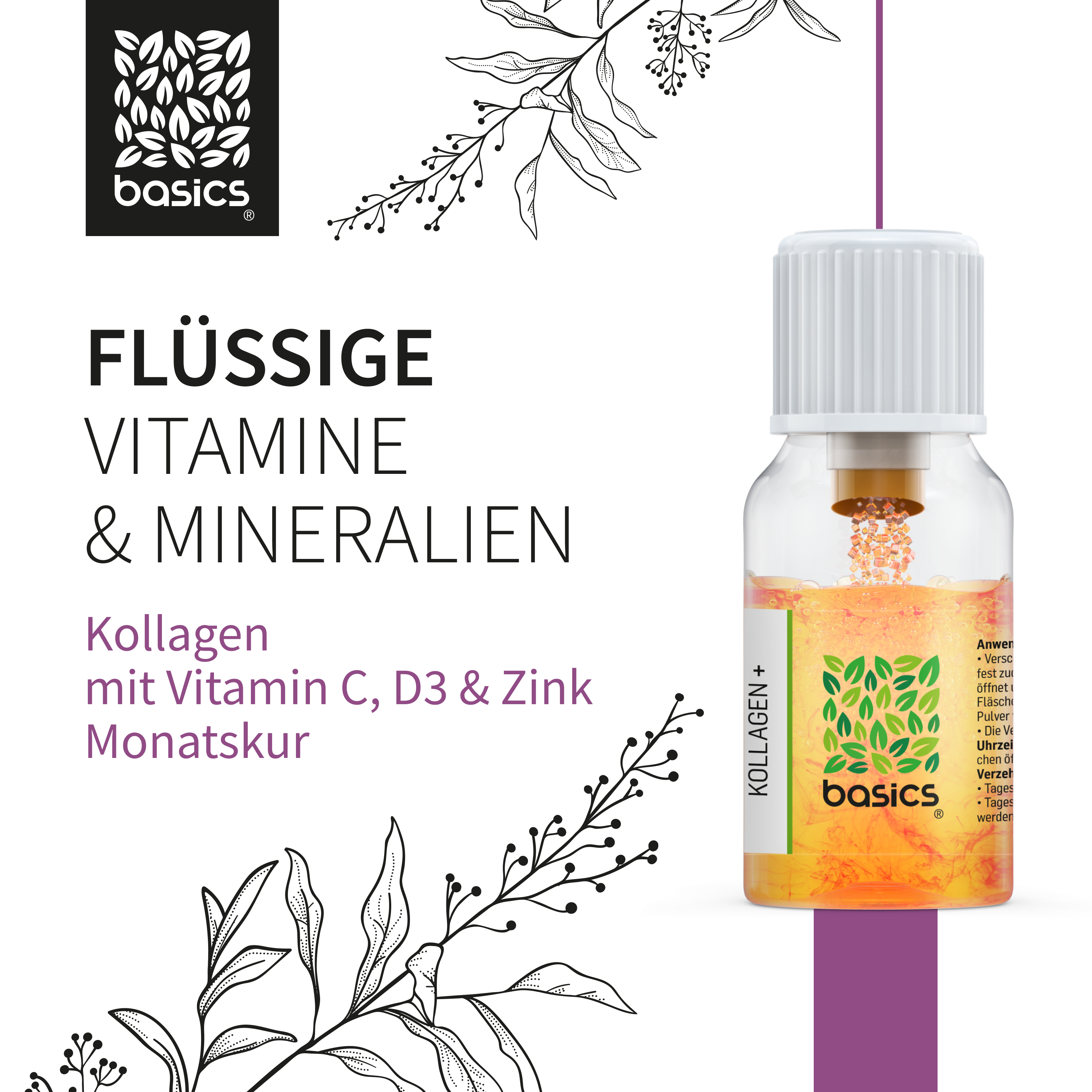 Kollagen ist ein Strukturprotein, das in Haut, Knochen, Knorpeln und Zähnen vorkommt. Verschiedene Lebensstilfaktoren wie Stress oder intensive Sonneneinstrahlung können den Körper fordern. basics Kollagen Plus kombiniert 100 mg Kollagen mit ausgewählten Vitaminen und Mineralstoffen – für deine tägliche Unterstützung von innen.
