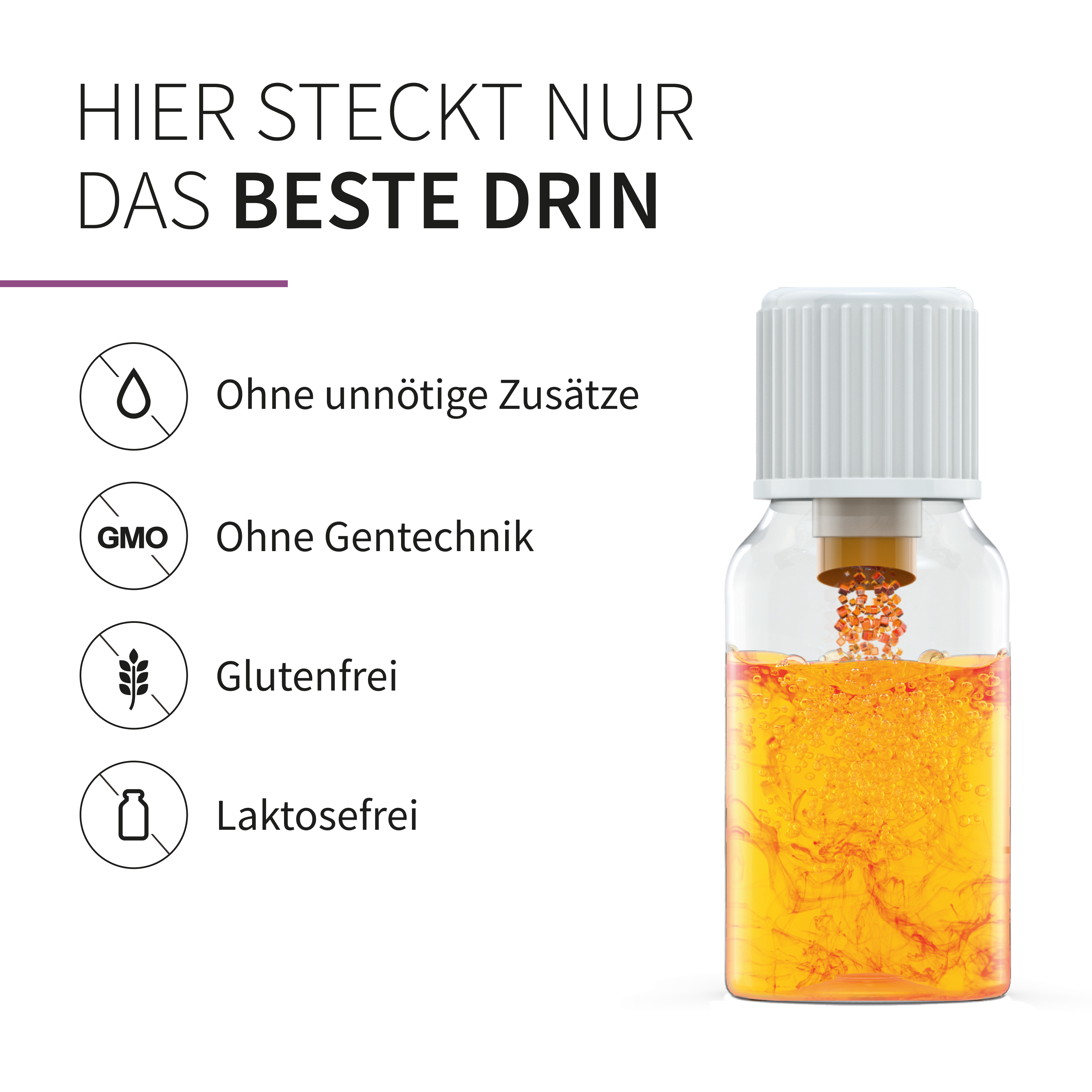 Dank des innovativen 2-Kammer-Systems genießt du immer frisch gemischte Inhaltsstoffe – ganz einfach, wann und wo du möchtest. basics Kollagen Plus ist laktose-, gluten- und fruktosefrei. Künstliche Farb- und Aromastoffe kommen bei uns nicht ins Fläschchen.