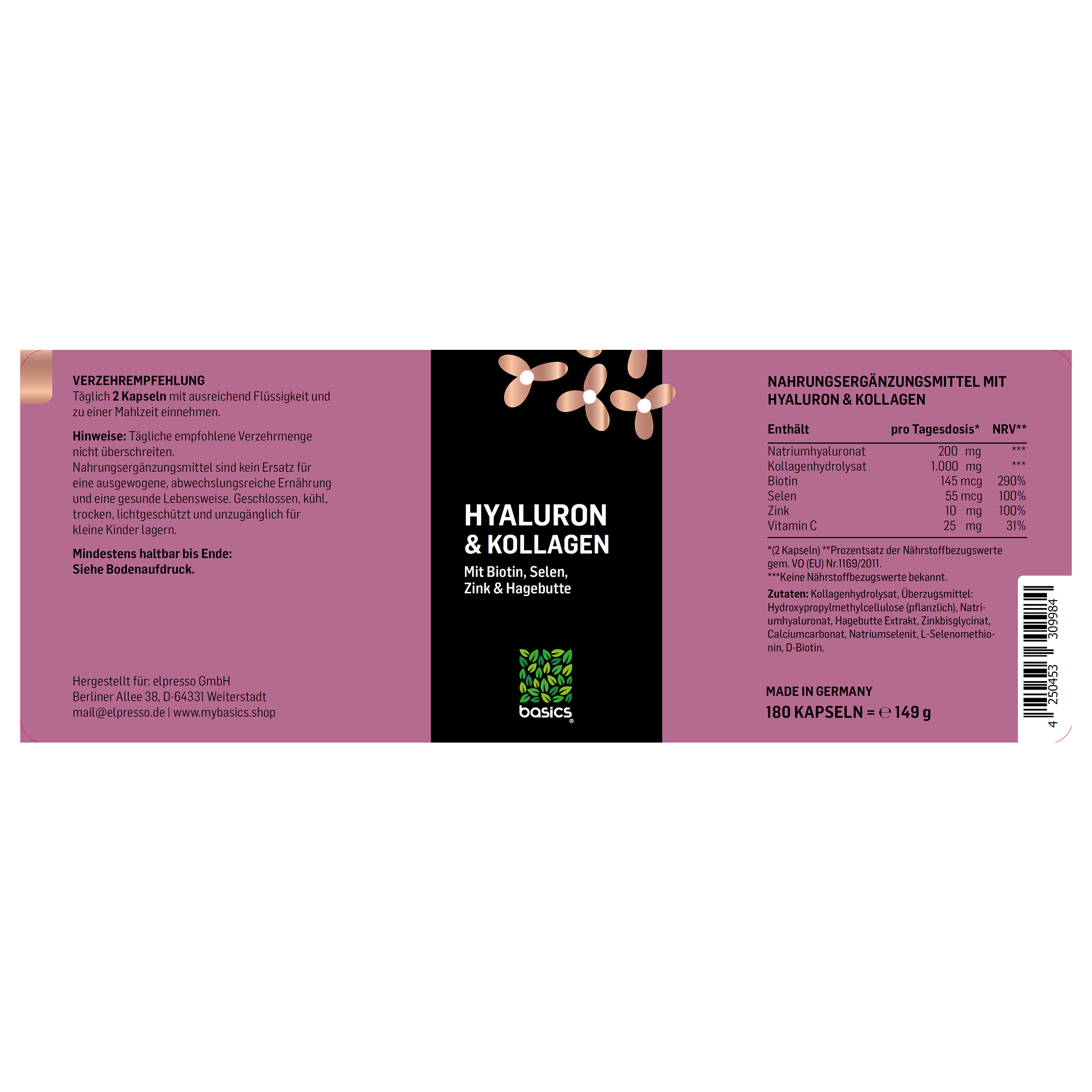Zutaten: Kollagenhydrolysat, Überzugsmittel: Hydroxypropylmethylcellulose (pflanzlich), Natriumhyaluronat, Calcium-L-Ascorbat, Zinkbisglycinat, Natriumselenit, L-Selenomethionin, D-Biotin.