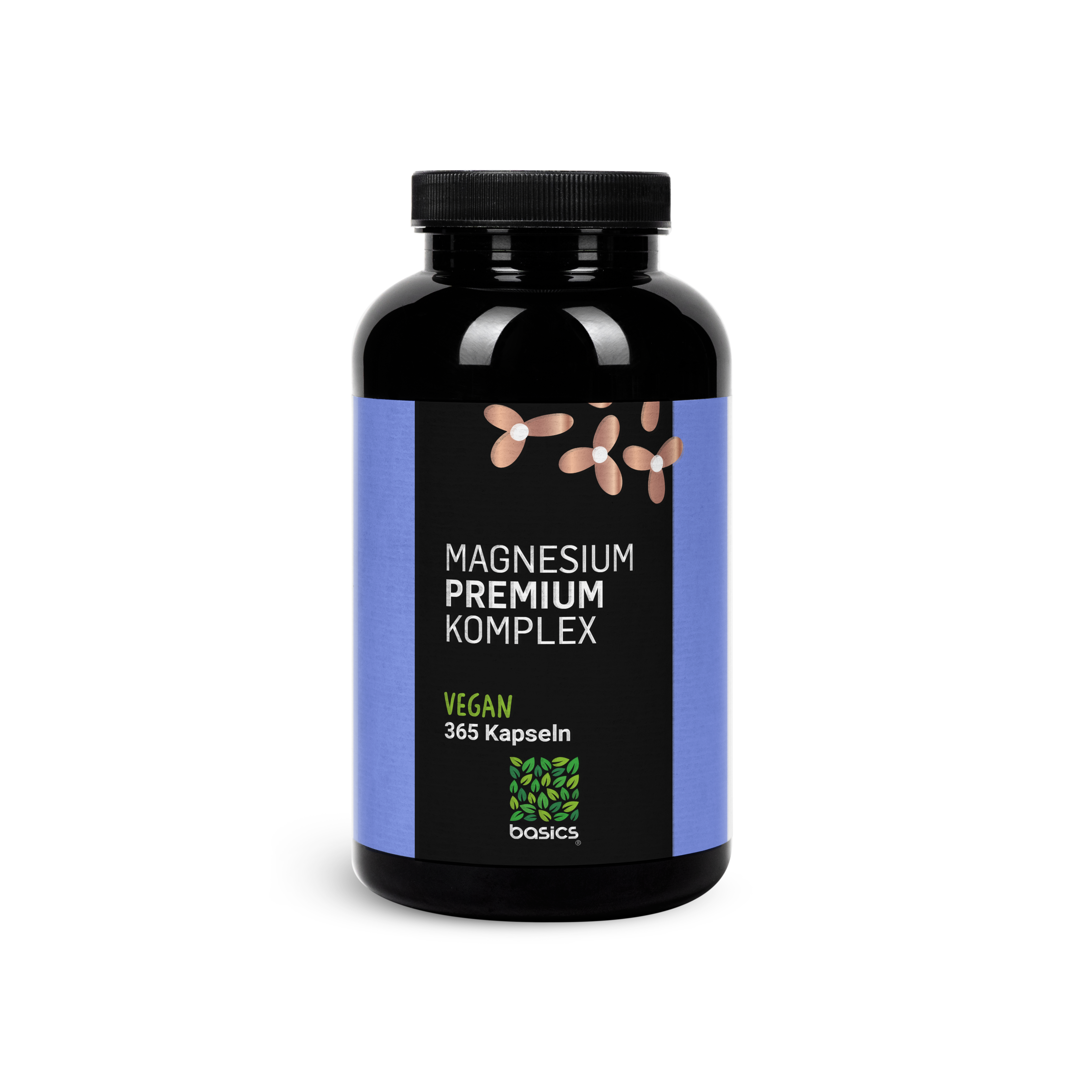 Magnesium ist ein lebenswichtiger Mineralstoff, den unser Körper nicht selbst herstellen kann. basics Magnesium Premium Komplex kombiniert fünf hochwertige Magnesiumverbindungen: Oxid, Citrat, Bisglycinat, Malat und Ascorbat – für eine vielseitige Versorgung, abgestimmt auf deinen Alltag.